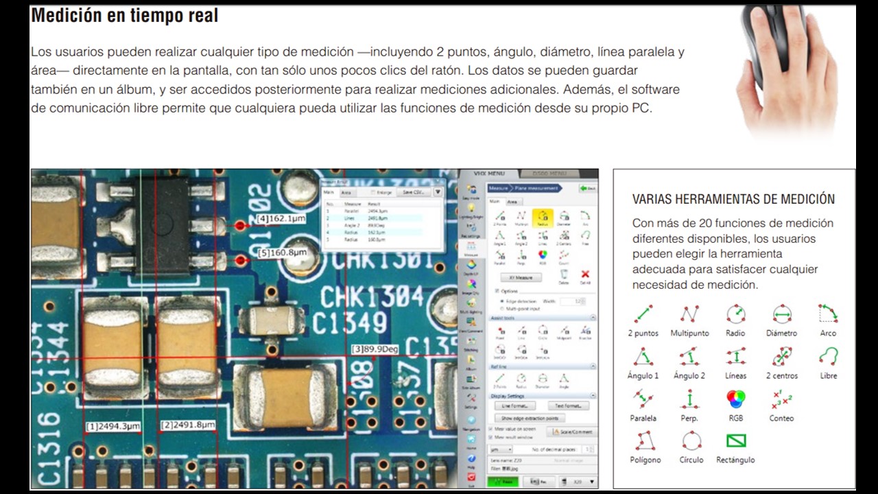 Función de medición dimensional de alta resolución El método de cambio de píxeles permite la captura de imágenes de alta resolución (4800 × 3600). Especificar el punto de medición en esta imagen de alta resolución, hace posible obtener mediciones con mayor precisión. Esta función es extremadamente útil en situaciones que requieren una mayor precisión de medición